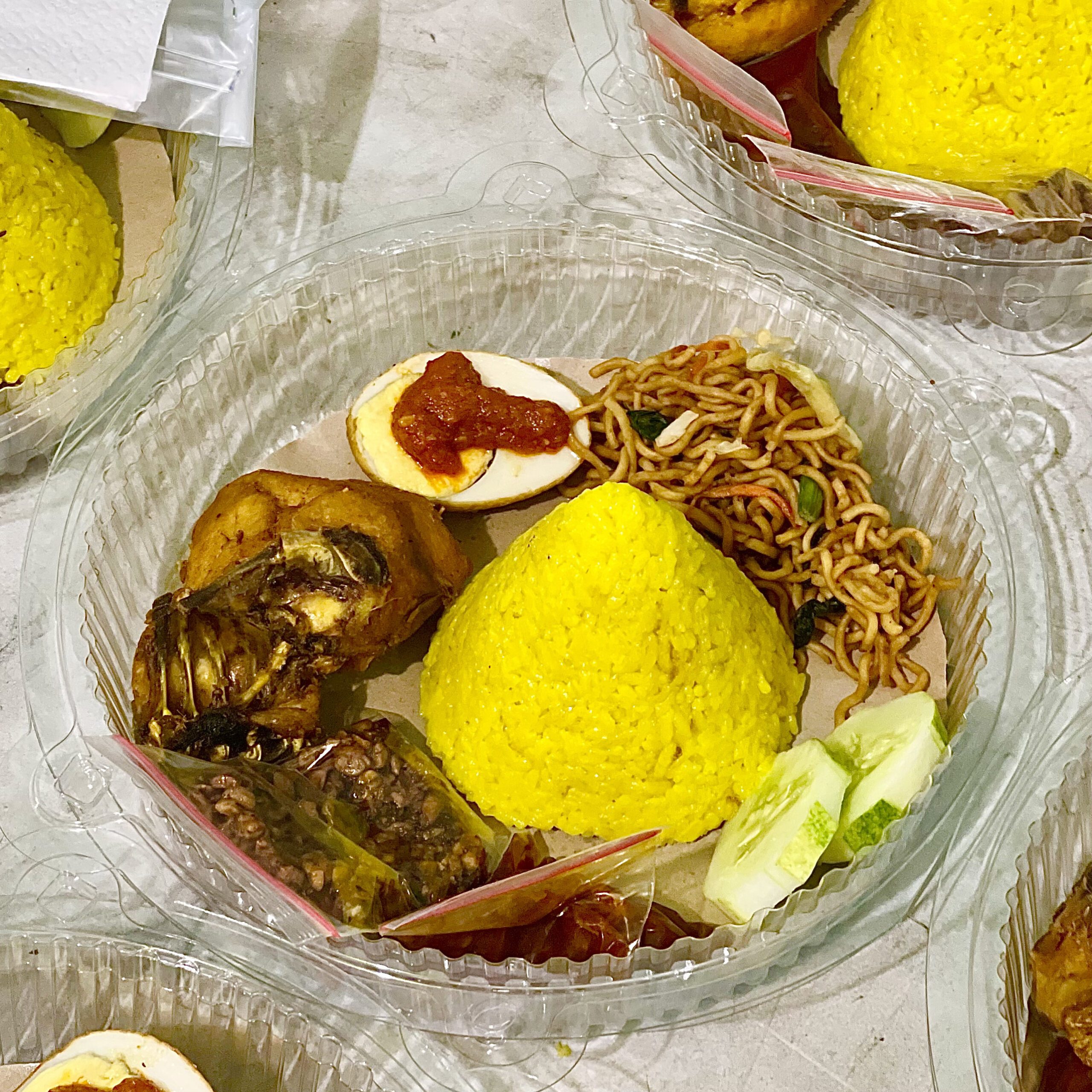 Paket nasi uduk dengan ayam goreng, telur merah, kue ku, mie goreng, kering tempe, timun, dan sambal. Lengkap dengan sendok, tisu, dan tusuk gigi.